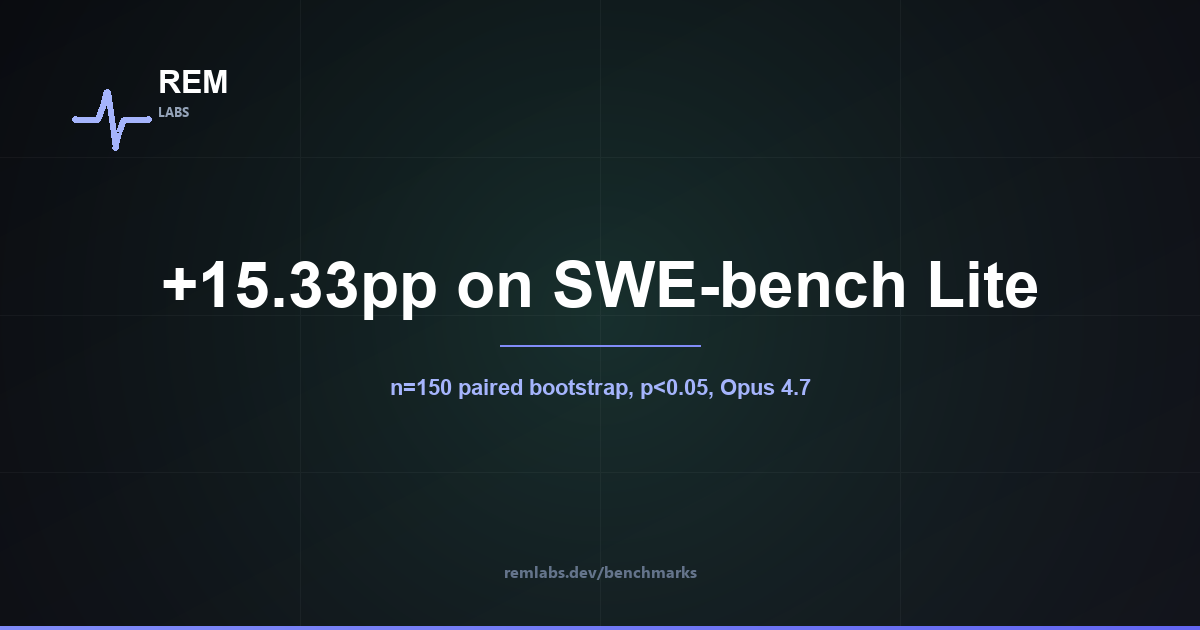 # clone the harness + predictions git clone https://github.com/remlabs-ai/swebench-rem-reproduction.git cd swebench-rem-reproduction # run the official evaluator against our REM-arm predictions (n=150, seed=42, Opus 4.7) docker run --rm -v $(pwd):/work swebench/eval:4.1.0 \ --pred /work/predictions/opus-rem-n150.jsonl \ --eval swe-bench-lite \ --seed 42 \ --out /work/results # cold baseline (same model, no REM context) for comparison docker run --rm -v $(pwd):/work swebench/eval:4.1.0 \ --pred /work/predictions/opus-cold-n150.jsonl \ --eval swe-bench-lite \ --seed 42 \ --out /work/results # expected: cold 30.00%, REM 45.33%, lift +15.33pp (CI [+9.33, +22.00], p<0.05)